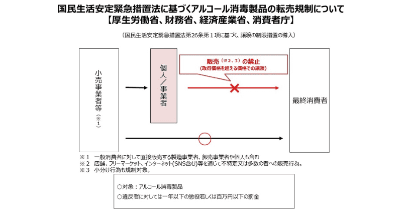この法律は、新型コロナウイルス感染拡大時に生活必需品となったマスクや消毒液などの商品を転売屋が買い占めたことが原因で制定されました。