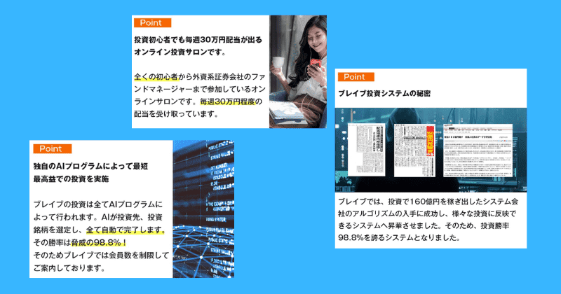 ランディングページ(LP)では毎週30万円の配当が受け取れるとしており、月収100万円を超えることも決して不可能ではないことになります。