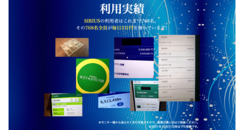 実際に、シリウスのランディングページ(LP)には、2021年10月31日時点の利用実績として「利用者はこれまで768名。その768名全員が毎日3万円を稼いでいます。」と記載されています。