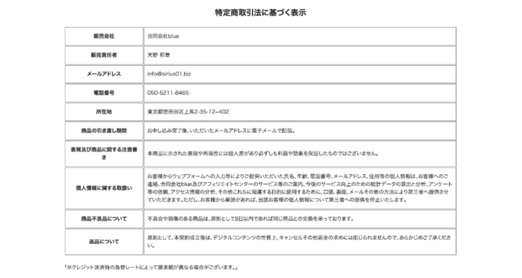 さらに、シリウスの個人情報や運営企業の情報、連絡先や商品に関する記載まで十分に記載されています。
