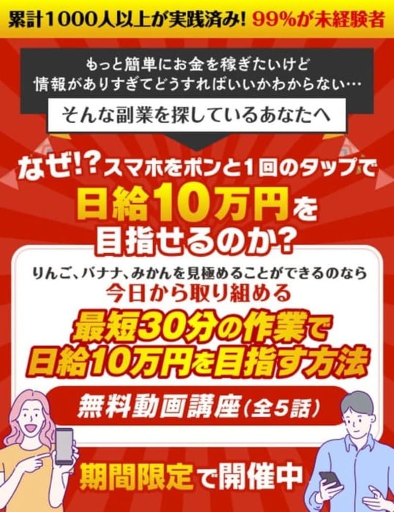 なので、りんご、バナナ、みかんを見極めることができるのなら今日から取り組めて、最短30分の作業で日給10万円を目指す方法について語っている無料の動画講座を今すぐに受講してください。
