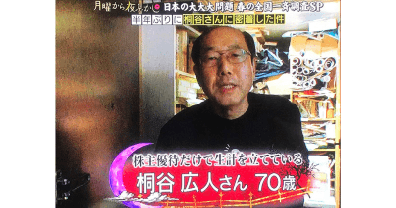 この株式投資からの不労所得で生活してる人の代表例が、人気テレビ番組「月曜から夜ふかし」に度々登場する「桐谷さん」ではないでしょうか。