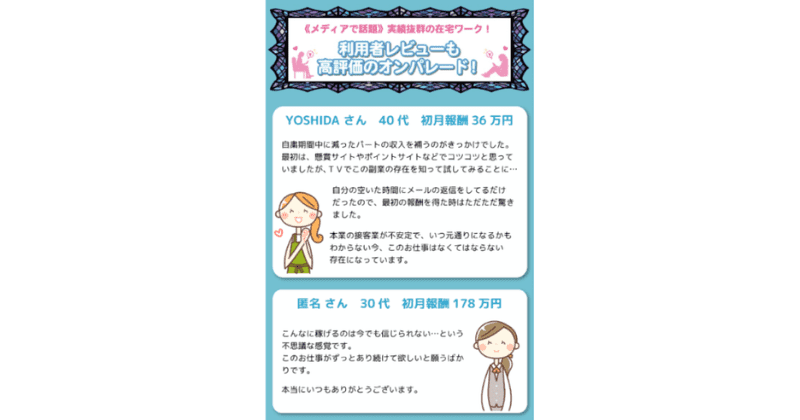 初月から受け取れている報酬に大きな差があることに疑問を感じますし、どのレビューを見ても具体的な内容については触れられていない点も怪しいです。