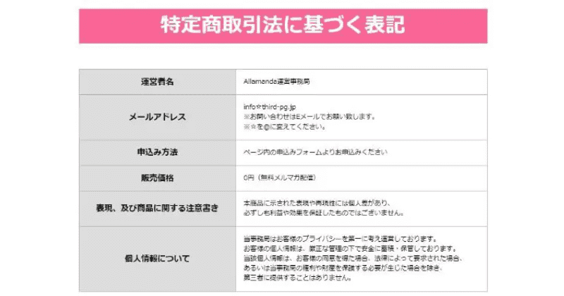 アラマンダには、特定商取引法(特商法)の表記がありましたが、企業名、電話番号、住所などの重要事項の記載がないので、かなり杜撰で危険と言えます。