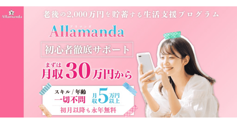 アラマンダは、老後の2,000万円を貯蓄する生活支援プログラム副業です。