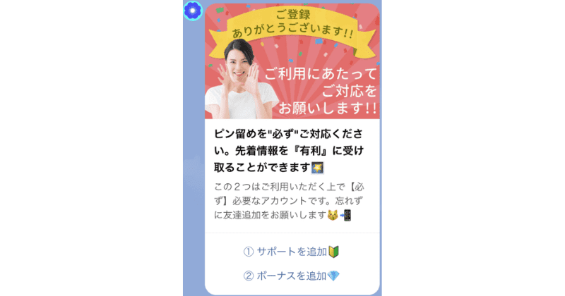 結局追加したところで何があるのかというと、サポートもボーナスも同じでLINEのピン留めを求めてきます。