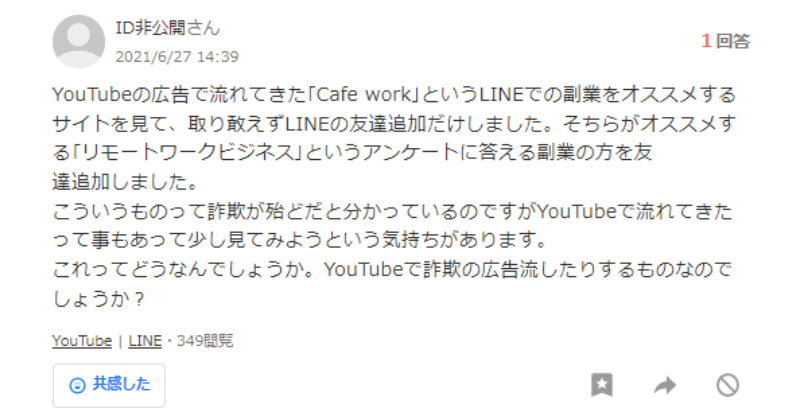 そんな中、「Cafe Work」「カフェワーク 副業 詐欺」「カフェワーク 知恵袋」等と検索したところ、Yahoo知恵袋でこのようなやり取りを見つけました。