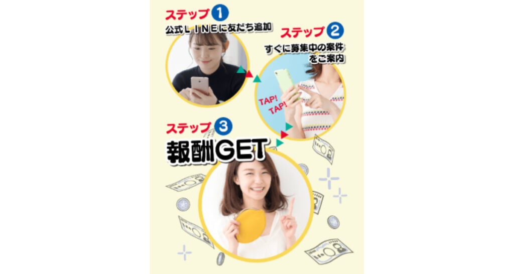 「サイトでお店選び→抽選&結果確認→モニター体験→アンケート等の提出→謝礼GET」という簡単な流れになっているので、誰でも取り組みやすいのが特徴です!
