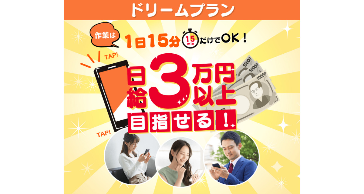 今回取り上げたドリームプランもその1つで、スマホをタップするだけで誰でも簡単に日給3万円が稼げるそうです。