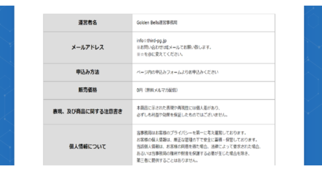 ランディングページ(LP)の下部に「特商法」という文字が書かれており、これをクリックすると上の画像が出てきます。