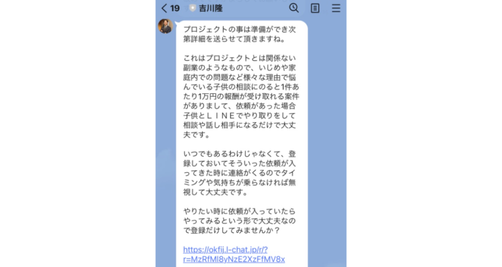 LINE登録を行うと、プロジェクト担当を名乗る吉川隆という人物から次のようなお願いメッセージが届きます。