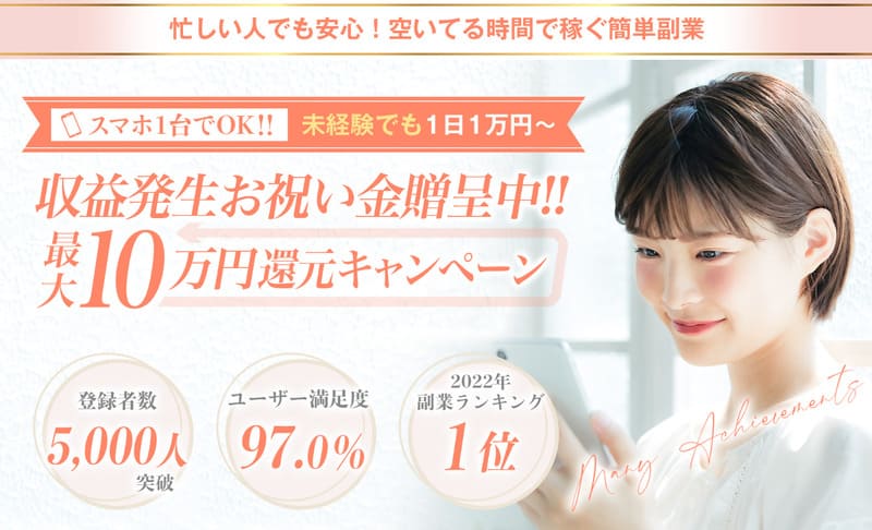未経験で誰でも簡単に1日1万円を稼げると謳っており、ユーザーの満足度の高さをアピールするなど注目を浴びているサイトです。