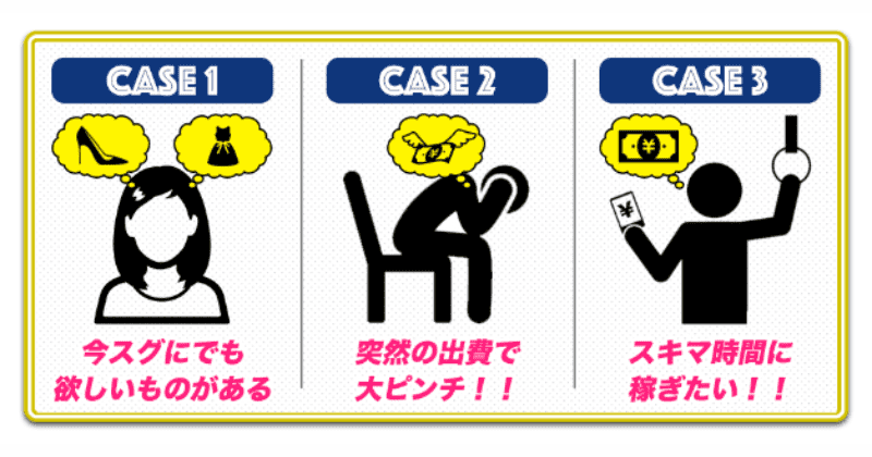 画像からも分かりますが、「今スグにでも欲しいものがある」「突然の出費で大ピンチ」「スキマ時間に稼ぎたい」という想いを持った方におすすめなんだそうです。