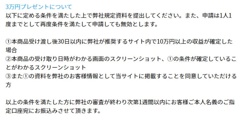 また、ランディングページで大々的に宣伝していた3万円プレゼントについて以下のような説明をしていました。