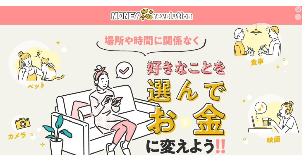 マネレボ/マネーレボリューションは「場所や時間に関係なく好きなことを選んでお金に変えよう!!」と謳って副業を紹介します。