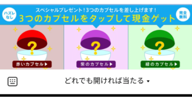 1つ紹介すると、3つのカプセルが表示され、開けば現金を手に入れられるという内容の案件の紹介メッセージがありました。