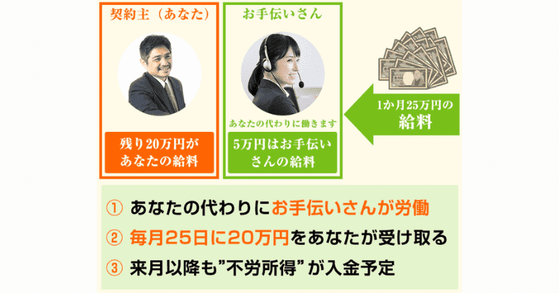 つまり「お手伝いさんが働いて得た給料を私たちが受け取るサービス」ということですが、さっそく意味が分かりません。