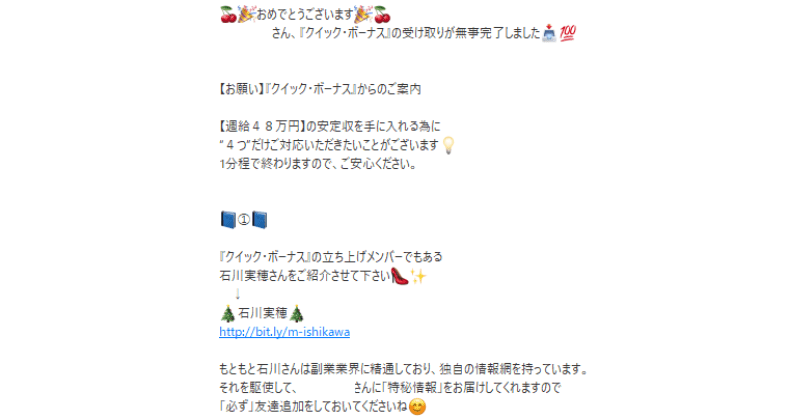 石川美穂のクイックボーナスは、未経験者でも週48万円が稼げると謳う副業サービスです。