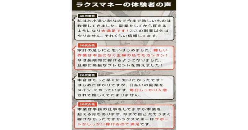 「ラク」ラク稼げる「ス」マホで副業だから『ラクスマネー』だそうですが、このような「楽して稼げる」と謳う副業には注意です。