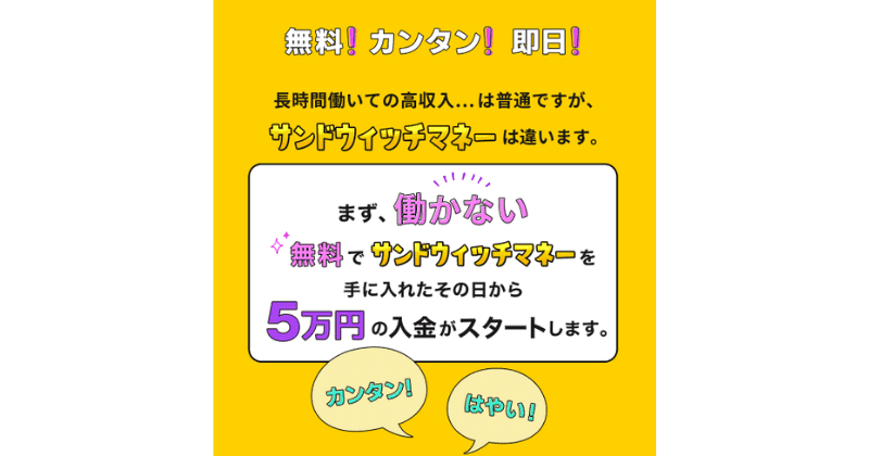 サンドウィッチマネーは、スマホ1台で5万円稼ぐことが可能な案件として紹介されています。財布がお金で溢れかえるとのことですが、見るからに怪しいですよね。