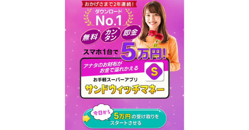 サンドウィッチマネーは藤原飛鳥という人物が仕掛け人の副業で、毎日5万円がスマホ一台で稼げると謳っているサービスです。