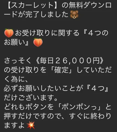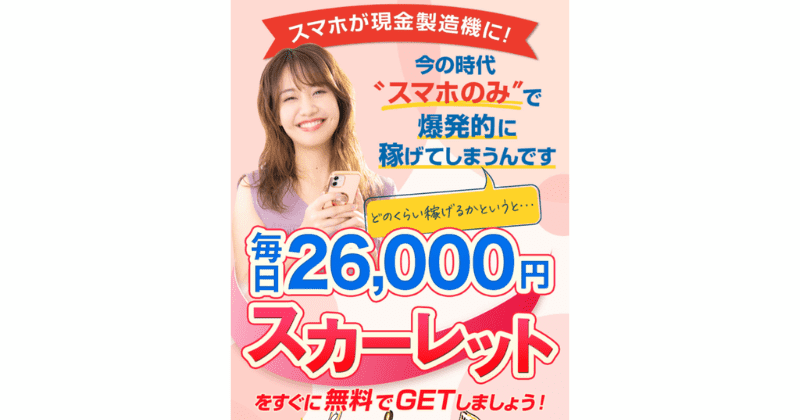 スカーレットは「爆発的に稼げてしまう。毎日26,000円稼げる」など誇大広告を謳っている悪質な副業案件です。