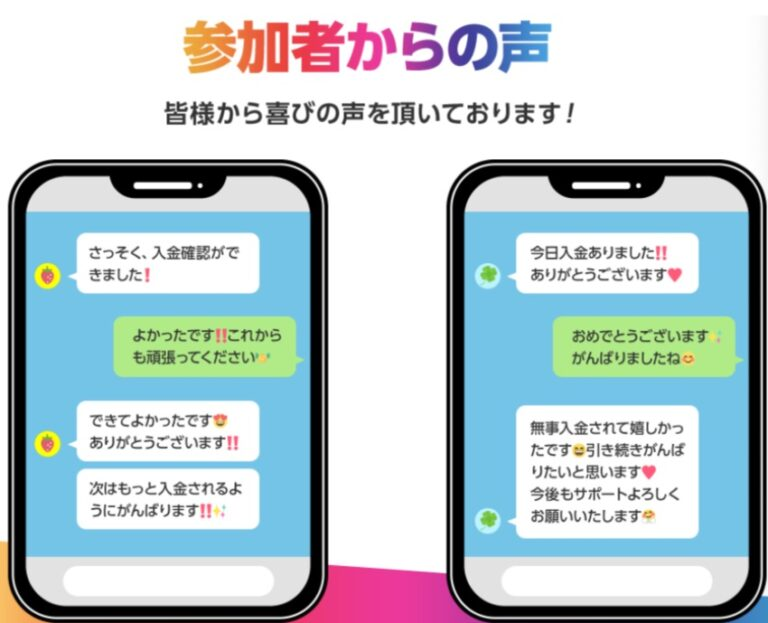 ランディングページ内には、参加者からの声として「稼げた」といったポジティブな内容が綴られていました。