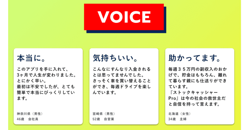 ランディングページ(LP)にはこのようなVOICEが出ていますね。